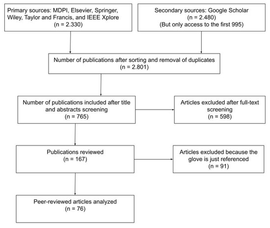 The present survey of smart gloves is aligned with the PRISMA guidelines for systematic reviews and meta-analysis [25]. As this is the first systematic review on this topic, the review protocol has not been registered. Data was sourced from published articles, see Figure 6. The primary databases searched were MDPI, Elsevier, Springer, Taylor and Francis, and IEEE Xplore. As a secondary source, Google Scholar was used. The primary keywords were “cyber glove”, “data glove”, “force-feedback glove”, “glove-based system”, “haptic glove”, “sensory glove”, “smart glove”, “virtual glove” and “VR glove”. In cases where the plural form provided additional relevant resources, it was also used. The inclusion and exclusion criteria were characterized by a title and abstract screening followed by a full-text and abstract screening process. Despite a large number of references were found in the primary and secondary sources, the screening process was quite straightforward because we focused on commercial devices. Many papers were discarded because no mention of commercial smart gloves was found. Next, 598 were discarded because they just mentioned some commercial glove, but not their use or an analysis of them.