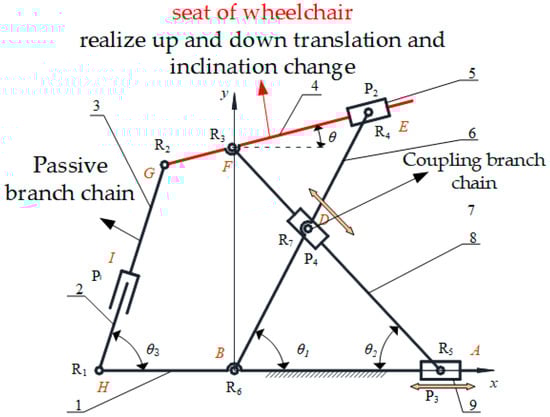 The mechanism shown in Figure 3 is a unilateral support structure under the chair seat. The left and right supporting mechanisms under the chair seat are identical; thus, only one side was selected for analysis. As the seat is fixedly connected to connecting link 4, the relationship between the height and angle of the seat can be simplified to the attitude change of connecting link 4. In this mechanism, the prismatic pair P4 and the revolute joint R7 are coupled to form a coupling branch chain. The passive rotary–prismatic–rotary (RPR) branch chain is formed with connecting link 3, connecting link 2 and prismatic pair P1, and the RPR branch chains on both sides are connected with a pedal for patients to step on. The lengths of connecting links 6 and link 7 are equal; driving horizontal moving pair P3 can adjust the height of the chair seat and jointly driving the moving pair P4 at the cross node and the lower horizontal moving pair P3 can adjust the wheelchair posture.