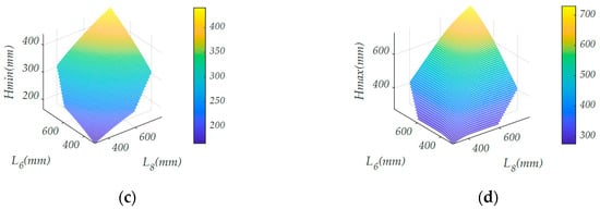 The relationship between each evaluation index and the length of two connecting rods: (a) the relationship between the maximum reachable angle and the length of the connecting rod; (b) the relationship between the minimum reachable angle and the length of the connecting rod; (c) the relationship between the maximum reachable height and the length of the connecting rod; (d) the relationship between the minimum reachable height and the length of the connecting rod.