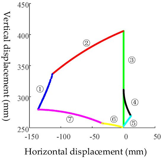 As a walking tool, the toilet wheelchair needs to have a certain seat tilt adjustment ability to stabilize the patient’s center of gravity, reduce discomfort and fear when moving on a sloping road and enhance the user’s safety and comfort. According to different seat heights, the effect of seat inclination adjustment will be different to some extent. The inclination change can be represented by the trajectory of point F on the moving platform, as shown in Figure 12.