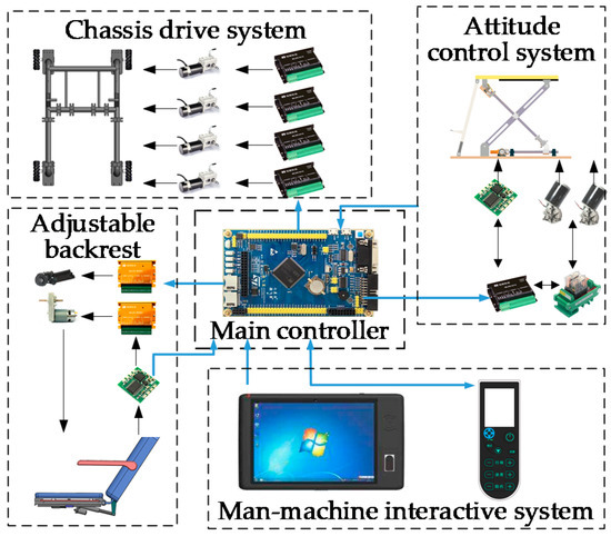 According to the corresponding functions, the control system was divided into five parts: a main control unit, a chassis walking system, an attitude adjustment system, a back-adjustment unit and a human–computer interaction system. Here, the main control unit is responsible for the management and operation of the whole wheelchair control system. The chassis walking unit consists of four Mecanum wheels and their driving motors to realize the omni-directional movement of the wheelchair. A gyroscope is arranged in both the attitude adjusting unit and the back adjusting unit to provide wheelchair attitude feedback and realize closed-loop control. The human–computer interaction unit is mainly used for the selection of the working mode, function parameter settings, operation status query and real-time display. Finally, the prototype design was completed, as shown in Figure 16.