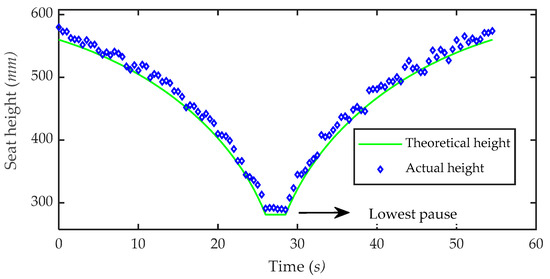 In order to verify the adaptability of the toilet wheelchair to different toilet heights, a seat height adjustment experiment was carried out. Volunteers were invited to ride in the toilet wheelchair. The height of the wheelchair seat was adjusted to the highest position as the initial state. The ball screw used to adjust the height was set to move at a linear speed of 5 mm/s. In the process of the experiment, the seat moved downward from the highest to the lowest position, paused for a while and then moved to the highest position. During the whole movement, the seat was kept in a horizontal position, and measurements were taken every 0.5 s to record the height of the seat surface. The experimental process is shown in Figure 17, and the experimental results are shown in Figure 18.