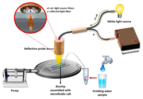 In this work, a label-free immunosensor based on white light reflectance spectroscopy (WLRS) for the rapid determination of Salmonella lipopolysaccharide (LPS) as well as Salmonella bacteria in drinking water samples is presented for the first time. The WLRS approach has been exploited for the detection of analytes of clinical interest (e.g., C-reactive protein and D-dimer) [39], as well as of analytes related to food safety (e.g., pesticides, mycotoxins) [40,41]. Moreover, it has been shown that it is possible to perform assays with the WLRS setup in complicated matrices such as milk [40] or whole blood [42] by introducing a short washing step after the primary immunoassay step. Thus, although WLRS is less sensitive in terms of refractive index changes detection than other label-free optical techniques such as SPR and might require some signal enhancement steps after immunoreaction, the low costs of instrumentation and related consumables (e.g., chips) render it suitable for the development of devices for on-site analysis. The sensor consists of a Si chip (5 × 15 mm2) covered with a thin SiO2 layer (approximately 1000 nm) on which the biomolecular reactions take place. The optical setup includes a reflection probe composed of seven 200 μm core fibers. The six fibers, arranged at the circumference of the reflection probe, are coupled to a visible-near infrared (NIR) light source and illuminate the sensor chip vertically through a transparent fluidic compartment, while the seventh fiber, placed at the center of the probe, collects the reflected light and guides it to a visible-NIR spectrometer (Figure 1). When the light strikes the chip, it is partially reflected at each interface, creating an interference spectrum. The buildup of a biomolecular layer on top of the chip, due to biomolecular reactions, increases the optical path length, resulting in a shift of the reflected spectrum that correlates with the concentration of the reacting biomolecules [43]. This spectral shift is transformed online by the dedicated software to increase in thickness, allowing the monitoring of the biomolecular reaction in real-time. For the particular application of Salmonella LPS and bacteria detection with the WLRS sensor, a competitive immunoassay was employed by immobilizing Salmonella LPS on the WLRS chip. For the assay, mixtures of calibrators/samples with a specific anti-Salmonella antibody were run over the chip with the final amount of antibody bound being inversely proportional to the analyte concentration in the calibrator/sample. In order to improve the assay detection limit and keep the assay duration as short as possible, the introduction of signal enhancement steps was investigated. In particular, reaction with biotinylated, anti-species-specific antibody (secondary antibody) followed by reaction with streptavidin was implemented. The shortest duration of each assay step for which adequate signal was achieved was selected for the final protocol. The analytical performance of the WLRS immunosensor was evaluated in terms of sensitivity, reproducibility, water matrix effect, and capability of chip regeneration/reuse. The accuracy of the assay was determined through recovery experiments performed using bottled and tap water, and the assay specificity against other bacteria species was verified. Finally, the performance of the WLRS immunosensor developed, mainly in terms of its detection limit and assay duration, was compared to that of other optical label-free immunosensors reported in the literature for Salmonella detection.
