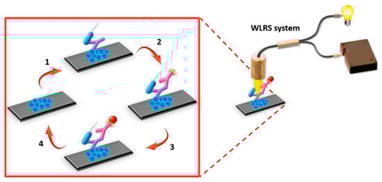 Assay configuration for the detection of S. typhimurium employing the WLRS system. The main assay steps included: (1) incubation of immobilized onto the chip lipopolysaccharide (LPS) with a mixture of bacteria calibrator and rabbit polyclonal anti-Salmonella antibody, (2) reaction with biotinylated Goat Anti-Rabbit IgG antibody (secondary antibody), (3) reaction with streptavidin, and (4) chip surface regeneration, i.e., removal of the immunosorbed molecules to use the chip for a new assay cycle.