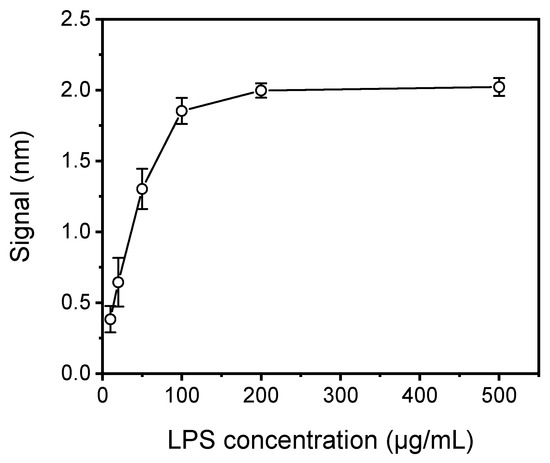 The real-time signal recordings provided from chips coated with LPS upon running calibrators with bacteria concentrations ranging from 5 × 102 to 5 × 107 CFU/mL are provided in Figure 7.