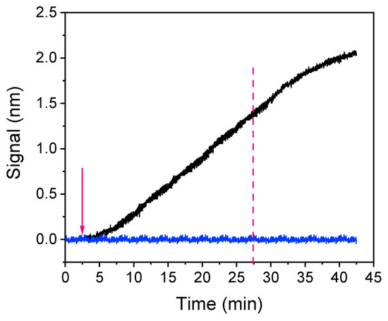 Real-time signal evolution upon passing over a chip coated with a 200 μg/mL Salmonella LPS solution zero calibrator consisting of a 3 μg/mL anti-Salmonella antibody solution mixed with assay buffer at a 1:1 volume ratio for 40 min (black line). For the assessment of non-specific binding, the zero calibrator signal obtained from a chip coated with bovine serum albumin (BSA) is indicated (blue line). The arrow indicates the time point of anti-Salmonella antibody solution introduction and the vertical, magenta dotted line the time point corresponding to 25 min after the introduction of the antibody solution.