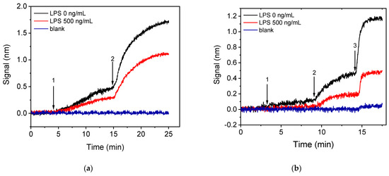 Real-time sensor response obtained from chips coated with a 200 μg/mL Salmonella LPS solution applying either the (a) two-step or (b) three-step assay configurations. The two-step assay configuration (a) included running over the chip 1:1 volume mixtures of calibrators with a 3 μg/mL rabbit anti-Salmonella antibody solution (arrow 1 to 2), followed by an Anti-Rabbit antibody solution (arrow 2 to end); while the three-step assay configuration (b) included running over the chip 1:1 volume mixtures of calibrators with a 1.5 μg/mL rabbit anti-Salmonella antibody solution (arrow 1 to 2), followed by biotinylated Anti-Rabbit IgG antibody (arrow 2 to 3) and streptavidin (arrow 3 to end). Black line corresponds to zero calibrator, red line to a calibrator containing 500 ng/mL LPS, and blue line to signal obtained from a chip spotted with BSA and assayed as the LPS-spotted chip.