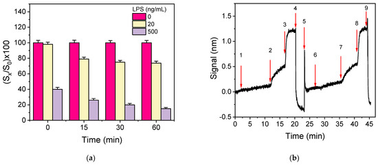 (a) Percent signal values obtained for the zero calibrator (magenta columns) or a calibrator containing 20 (yellow columns) or 500 ng/mL of LPS (grey columns) without or with 15, 30, and 60 min pre-incubation of the calibrators with the anti-Salmonella antibody solution (1.5 μg/mL). Each column represents the mean value of five measurements ± SD. (b) Real-time sensor response obtained upon running zero calibrator prepared in assay buffer (arrows 1–4), regeneration (arrows 4–6), and zero calibrator in bottled water (arrows 6–9).