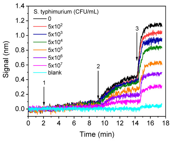 Real-time sensor responses corresponding to S. typhimurium bacteria calibrators with concentrations from 5 × 102 to 5 × 107 CFU/mL prepared in assay buffer. The arrows indicate the sequence of solutions running over the chip: assay buffer, start to arrow 1; mixture of calibrators with anti-Salmonella antibody, arrow 1–2; biotinylated anti-rabbit IgG antibody, arrow 2–3; streptavidin.