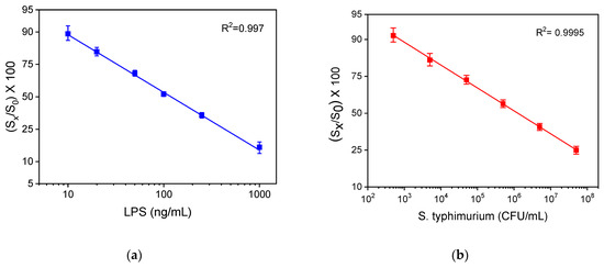 The calibration curves of LPS and S. typhimurium bacteria obtained with the WLRS sensor and the three-step assay, with a total assay time of 15 min, are presented in Figure 8a,b, respectively. The detection limit (LOD) of the assay was calculated as the concentration corresponding to signal that equals to the mean valueof 20 replicate measurements of zero calibrator -3SD, and it was determined to be 4 ng/mL for LPS and 320 CFU/mL for bacteria. In addition, the quantification limit (LOQ), which corresponds to the concentration of the mean value of 20 replicate measurements of zero calibrator -6SD, was found to be 10 ng/mL for LPS and 600 CFU/mL for bacteria. The dynamic range of the assay was 10–1000 ng/mL, and 600–5 × 107 CFU/mL for LPS and bacteria, respectively.