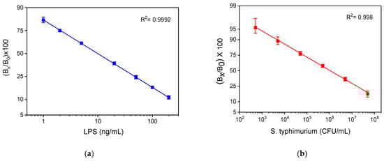One hundred microliters of a 0.5 μg/mL LPS solution in coating buffer were added in 96-well ELISA microtitration plates and incubated overnight at RT. The wells were washed twice with 300 μL of 10 mM PBS buffer, pH 7.4 (washing solution A), and then 300 μL of blocking solution were added. After incubation for 1 h at RT, the wells were washed as previously. Equal volumes of LPS, bacteria calibrators, or samples were mixed with a 100 ng/mL rabbit polyclonal anti-Salmonella antibody solution in assay buffer and incubated for 15 min. For the assay, 100 µL from the mixtures were added to wells and were incubated for 1 h under vigorous shaking. After that, the wells were washed four times with 300 μL of washing solution A solution containing 0.05% (v/v) Tween 20 (washing solution B), 100 μL of a 10 μg/mL anti-rabbit IgG antibody-horse radish peroxidase (HRP) conjugate solution in 0.1 mM Tris-HCl buffer, pH 8.25, containing 5 mg/mL BSA, and 9 g/L NaCl were added per well and incubated for 40 min under vigorous shaking. The wells were washed as previously, and then they were incubated with 100 μL of HRP substrate solution (0.03% v/v H2O2 and 1.9 µM ABTS in 0.1 M citrate-phosphate buffer, pH 4.5) for 30 min under shaking. The optical density of the wells at 405 nm was measured using a VICTOR3 1420 Multilabel Counter (PerkinElmer). For the calibration curve, the optical density value of the different calibrators (Bx) expressed as a percentage of the mean zero calibrator optical density value (B0) was plotted versus the calibrator concentration.
