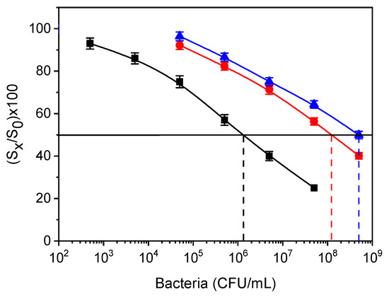 Calibration curves for S. typhimurium (black squares), E. coli (red circles), and S. thomson (blue triangles) obtained from LPS-coated WLRS chips. The dashed vertical lines indicate the bacteria concentration that corresponds to a 50% signal drop with respect to zero calibrator (horizontal black line). Each point is the mean value of the signals obtained from three chips ± SD.