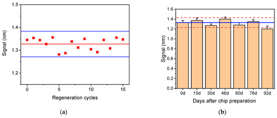 The storage stability of the LPS-modified chips was determined by preparing a batch of 21 chips and stored them in a desiccator at 4 °C for a period of three months. At regular time intervals, three chips were taken out and tested. In Figure 11b, the mean values obtained for the zero calibrator over the period of 3 months are provided. As shown, only a slight decrease (approximately 10%) in the zero calibrator signal value was observed after 3 months of storage, which, however, did not affect the calibration curve. Thus, it could be claimed that the LPS-modified chips are stable for at least 3 months under the specified storage conditions.