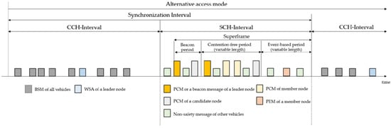 Satisfying the periodicity of control message transmission during vehicle platooning is a critical issue in terms of control. In this regard, Böhm and Kunert have proposed a fair communication method in which a leader vehicle allocates a time slot of transmission to each vehicle belonging to its platoon within a given superframe [24]. To ensure the reliability of vehicle platooning, a leader vehicle explicitly acknowledges individual vehicles whenever member vehicles transmit their messages. In addition, every vehicle is also required to acknowledge receipt of the leader vehicle’s message. In this approach, a given superframe is divided into two phases. The first phase is designed for a leader vehicle to collect the information of the member vehicles as each vehicle transmits its status information in the time slot assigned to it. In the second phase, a leader vehicle individually informs each vehicle of control information for vehicle platooning. During the first phase, one or more vehicles can fail to transmit their message in the assigned time slots. A leader vehicle continuously allocates a new time slot to all failed vehicles until either allfailed vehicles succeed the transmission of its control message or all the time slots assigned in the first phase are exhausted. In the worst case, thus, the second phase is postponed until a maximum period defined for the first phase is consumed. Even in the second phase, if a leader vehicle fails to transmit a control message for each member vehicle, it should also retransmit control messages after its scheduled transmissions for every vehicle are finished. In this protocol, there should exist an explicit phase to collect status information so that a leader vehicle controls all vehicles in a platoon by transmitting control messages required for vehicle platooning. All platooning vehicles are responsible for explicit acknowledgments for all data transmission within the assigned time slot. Depending on the vehicle density on an urban road, contentions for transmission can be significantly intensified so that it may be difficult to guarantee a stable platoon. Furthermore, when a leader node leaves its platoon, its platoon is bound to be destroyed and a new platoon should be constructed again. In a dynamic driving environment such as an urban road, there is a desire to maintain a platoon no matter which vehicle leaves.