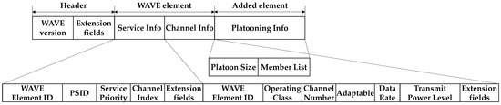 In DUPP, three segments (Service Info, Channel Info, and Platooning Info) are used for the leader node’s WSA message as shown in Figure 2, which illustrates a new WSA message used for DUPP designed for urban platooning. To notify the availability of urban platooning, the Platooning Info segment is newly added. The size of the WSA message used for DUPP is a total of 48 bytes. We discuss each segment in detail in the following.