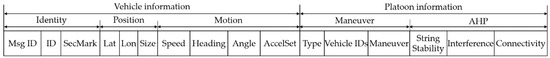 In DUPP, the three messages supporting a local platoon are designed: a beacon message, PCM, and PEM as discussed above. To maintain stable urban platooning, DUPP exploits a part of the existing SAE J2735-based BSM part 1 to share vehicle information and extends it to contain additional information regarding a local platoon. As shown in Figure 3, this extension illustrates the basic form of three messages. The basic form consists of two elements of vehicle information and platoon information.