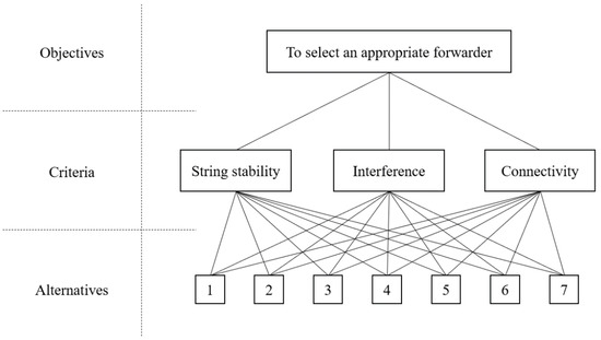 The AHP approach is useful in systematically solving the problem of decision-making that may be differentiated depending on the degree of influence of the interrelated and complex criteria required for decision making [33]. In the AHP approach, the definition of criteria and the calculation of their weight are critical to assess the alternatives. The structure of the proposed AHP-based forwarder selection of DUPP is shown in Figure 4. The fundamentals of AHP consist of the definition of criteria, the pairwise comparison between criteria, pairwise comparison between alternatives, and the priority calculation for achieving an objective [34,35,36,37]. The proposed AHP-based forwarder selection of DUPP follows the AHP’s fundamental processes, focusing on the development of the following four items: the definition of three criteria, the definition of grades for each criterion and for each node, the calculation of the decision weight, and the priority decision. The AHP methodology allows DUPP to determine which alternative is the most consistent with our three criteria and the degree of importance.