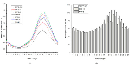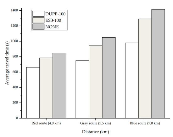 In the case of the red route with 4.0 km, the average travel time for DUPP-100 corresponds to 84% of that of ESB-100 and 78% of that of NONE, respectively. In the case of the blue route with 7 km, the average travel time for DUPP-100 corresponds to 76% of that of ESB-100 and 69% of that of NONE, respectively. As the route is lengthened, not only the difference between DUPP-100 and ESB-100 but also the difference between DUPP-100 and NONE increases. Furthermore, the average travel time of DUPP-100 does not increase significantly even when comparing the red route with the blue route. DUPP-100 increases by only 319 s from the red route to the blue route while ESB-100 increases by 506 s. Especially, an increase in the distance of the route indicates that the road’s uncertainty increases. In other words, due to many signalized intersections and unexpected traffic conditions, vehicles might perform different urban platooning maneuvers frequently. Hence, under high uncertainty, it is difficult for ENSEMBLE-enabled urban platooning to maintain the existing local platoons, since an existing local platoon is destroyed even when one of the vehicles leaves its local platoon. As a result, as the driving distance increases, ENSEMBLE’s performance may deteriorate.
