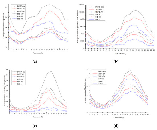 Another performance indicator is the lifetime of an existing local platoon. This performance metric can illustrate if the protocol has the capability to respond quickly to the dynamic topology of the urban environment. In addition, it is significantly associated with the durability, continuity, and stability of existing local platoons. For each protocol, we measure the average lifetime until the local platoon is destroyed after a local platoon is created, the average number of the local platoons generated and maintained, and the average length of the generated local platoons for 24 time zones. The measured results are illustrated in Figure 8. In Figure 8a, DUPP has a tendency that the average lifetime of the local platoons increases as the vehicle density on the road increases. An increase in the vehicle density can be explained by the three scenarios in which the number of vehicles participating in the urban platooning increases (i.e., DUPP-30, DUPP-60, and DUPP-100) and the flow of time towards the peak time zone 16. In DUPP, the inflow and outflow of other nodes to the existing local platoons are performed immediately according to the traffic conditions. Since local platoons are maintained as long as possible even though the nodes are leaving or splitting from it, DUPP shows better performance as vehicle density increases.