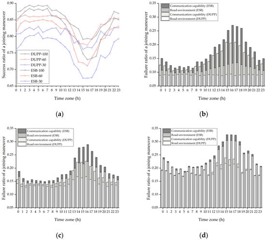 Success ratio of joining maneuver: (a) success ratio of a joining maneuver; (b) failure ratio of a joining maneuver under DUPP-100 and ESB-100; (c) failure ratio of a joining maneuver under DUPP-60 and ESB-60; (d) failure ratio of a joining maneuver under DUPP-30 and ESB-30.