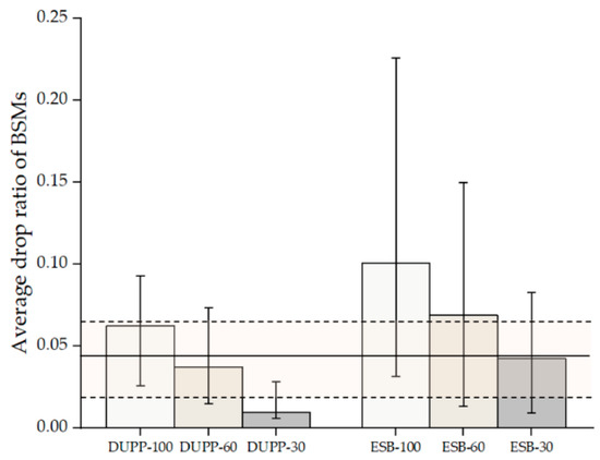 The external cost of PCM transmission is measured as the drop ratio of BSMs on CCH to show the extent of the operations of DUPP affecting the performance of other vehicles regardless of given urban platooning. The average drop ratio of BSMs is measured by dividing the number of received BSMs by the number of transmitted BSMS for all nodes. Figure 10 shows the results of the average drop ratio of DUPP and ENSEMBLE as bar graphs. To fairly compare the performance of the two protocols, we first define the normal scenario, which is a certain driving condition where there exist only vehicles with communication capability and not to participate in urban platooning. The average drop ratio of the normal scenario is shown as a line graph between the upper and lower dashed lines in Figure 10. The upper and lower dashed lines indicate the maximum and minimum drop ratios in the normal scenario, respectively. The average drop ratios of DUPP-100, DUPP-60, and DUPP-30 are 0.063, 0.036, and 0.009, respectively. The average drop ratio of DUPP is usually within the range of variation of the result of the defined normal scenario and the slight difference between DUPP and the normal scenario is derived from the WSA transmission in the operation of DUPP. On the other hand, since ENSEMBLE operates only on CCH, its drop ratio increases significantly. In addition, BSM transmissions cannot be guaranteed while the vehicle density increases due to the nature of CSMA/CA mechanism. In detail, ESB-100 has an average drop ratio of 0.1, and ESB-60 and ESB-30 have those of 0.068 and 0.042, respectively. In the worst case, ENSEMBLE (i.e., ESB-100) has a very high average drop ratio of 0.225.