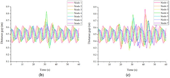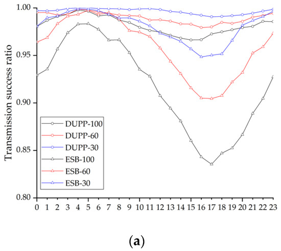 As shown in Figure 11a, the result shows that the periodicity of DUPP-100 is better than that of ESB-30. As interference increases, the transmission success ratio typically decreases. Figure 11a shows there is a tendency that all results related to the performance deteriorate as the time approaches the peak time zone and the number of vehicles participating in urban platooning increases. However, although the worst value of the average transmission success ratio of DUPP is 0.969, the DUPP’s performance does not significantly decrease over the entire time zone. Moreover, even in DUPP-100, Figure 11b shows that the DUPP-enabled vehicles stably drive with complying with the velocity specified by a leader node. The inter-vehicle distance under DUPP-100 presented in Figure 11b is during the time DUPP-enabled vehicles have a transmission success ratio of 0.9427. Figure 11c shows the result of ESB-100 having a transmission success ratio of 0.9219. The more its periodicity is destroyed, the more difficult it becomes to maintain stable driving. Due to severe traffic congestion and a signalized intersection, while driving for 60 s, vehicles belonging to that specific local platoon experience the first stable driving from 0 to 10 s, the second slightly unstable driving from 10 to 30 s, the third greatly unstable driving, and the last stable driving from to 60 s. Figure 11b shows that in DUPP-100, the second slightly unstable driving starts at 10 s but it is stabilized soon. After the third greatly unstable driving lasts for about 10 s after 30 s, the last stable driving starts at about 40 s. Figure 11c shows that in ESB-100, the second slightly unstable driving starts at 10 s and lasts until 30 s, the third greatly unstable driving lasts to 45 s. During this period, DUPP-100 quickly recovers from unstable driving such that the distance gap between the intermediate nodes fluctuates for a while, maintaining its safety distance.