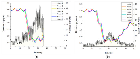 To evaluate the adaptability to unexpected situations through forwarder selection, the stability is examined by showing the maintenance of safety distances between the vehicles for a given local platoon in Figure 12. The number of PEMs transmitted after detecting a certain event is also shown in Figure 12. The unexpected event naturally occurs if vehicles step on the brake when either they enter a congested road section or a vehicle makes a lane change in front of a given local platoon in this experiment. Before a certain event is detected by vehicles of one and more local platoons, all vehicles belonging to a given local platoon drive at a speed of 36 km/h and maintain a safety distance of 8 m. After they enter the congested area from 15 s in Figure 12, a leader node marked as Node 1 in a given platoon starts to apply the brake, and from 25 s, they are in the most congested road section where there are many local platoons. After 40 s, they start to leave this area. Therefore, after 12 s, the PEMs related to the braking event start to be generated and transmitted.
