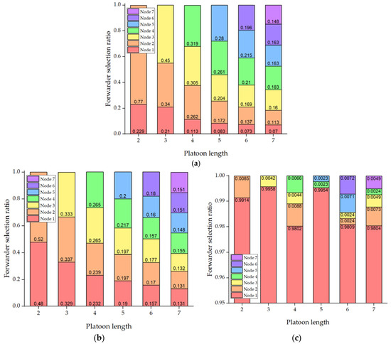 Forwarder selection ratio for each platoon length under DUPP-100: (a) the effect of the string stability on AHP-based forwarder selection; (b) the effect of the interference on AHP-based forwarder selection; (c) the effect of the connectivity on AHP-based forwarder selection.