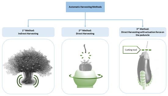 With the introduction of a wide variety of robotic solutions for fruit harvesting and the design of new grippers and end-effectors in recent years, it is convenient to update the classification of automatic harvesting methods to include these latest technologies. The classification proposed in this review is an extension of that carried out in [], which classified the removal of the fruits into two groups: (i) those in which the application of direct force to the harvested portion is necessary and (ii) those that deliver the removal energy indirectly as an inertial force response that causes detachment by accelerating the attachment support away from the harvest object. Consequently, harvesting methods are divided into three main groups, which are shown schematically in Figure 1: