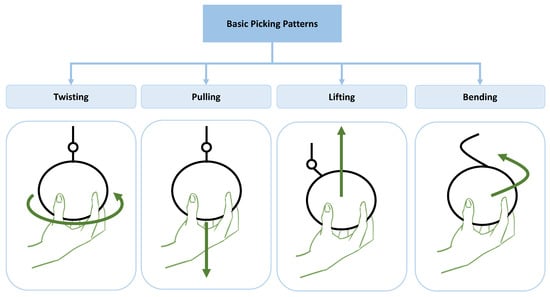 As stated above, the fruits harvested by means of the methods classified in group 2 pose a challenge in the field of robotic manipulation. One of the research paths in this field is based on the idea of studying and decomposing the human movements performed during the harvesting of fruits and replicating them using robotic grippers. These movements are grouped under the concept of picking patterns, which include, among others, the movements of bending, lifting, twisting, and pulling or a combination of them. In Figure 2, the basic picking patterns are shown conceptually.
