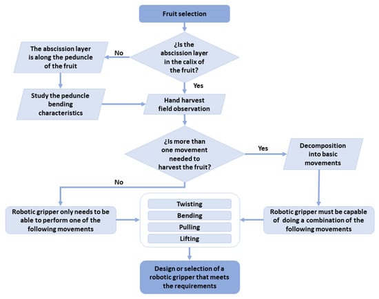 In the literature, there are studies available on picking patterns for (i) tomatoes [,,], (ii) kiwis [], (iii) apples [] and (iv) strawberries [,]. It is also worth mentioning the study presented in [], in which the movements of the hand and the human body in the harvesting process are analysed to provide a guide for the design of new grippers and end-effectors of anthropomorphic inspiration. The scheme shown in Figure 3 summarizes the proposed steps to follow for the design or selection of grippers and end-effectors required to harvest fruits by means of direct contact methods.