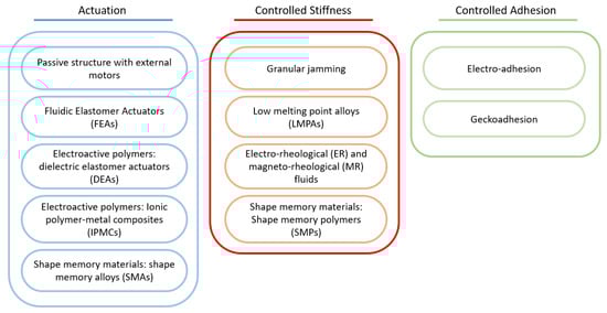 In this context, soft technologies can be defined as the set of theories, techniques and procedures that enable key functions of soft robotic grippers, such as actuation, gripping and shape control methods. Although different authors have proposed a great variety of soft technologies [,,,,], the main objective of all of them is to guarantee the safe interaction of the device with humans and the environment by using materials with a module similar, in terms of rigidity, to that of soft biological materials []. Several reviews of soft grippers can be found in the literature [,,,,,,,], presenting various approaches to classify existing technologies. One of the most widely used approaches is the one that classifies the soft gripping technologies according to three different categories [,]: (i) actuation, (ii) control stiffness and (iii) controlled adhesion. However, it is currently possible to find devices whose designs simultaneously combine characteristics from several of these categories. Figure 4 shows the complete classification of the current soft gripping technologies based on the mentioned categories.