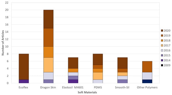 As shown in Figure 5, the five most commonly used materials are Dragon Skin, Ecoflex, polydimethylsiloxane (PDMS), Elastosil M4601 and Smooth-Sil, which are all silicone elastomers. Other polymers are Agilus30/VeroClear, ultra-high molecular weight polyethylene, electrostatic discharge (ESD) plastic sheet, thermoplastic elastomers (TPEs) and thermoplastic polyurethane (TPU).