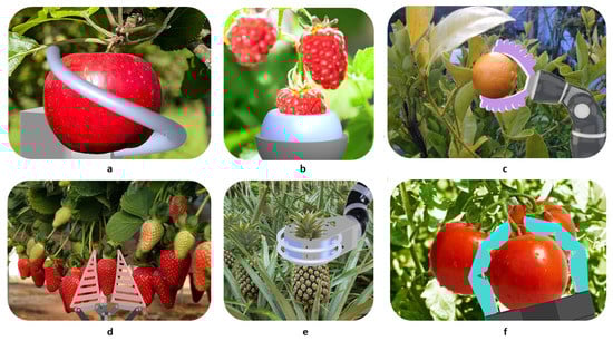 Hypothetical harvest scenarios with several soft grippers. (a) Soft continuum gripper based on [], (b) end-effector based on [], (c) bellow-type soft gripper based on [], (d) multi-choice gripper based on [], (e) circular soft gripper based on [,], and (f) tendon-driven soft gripper based on [].