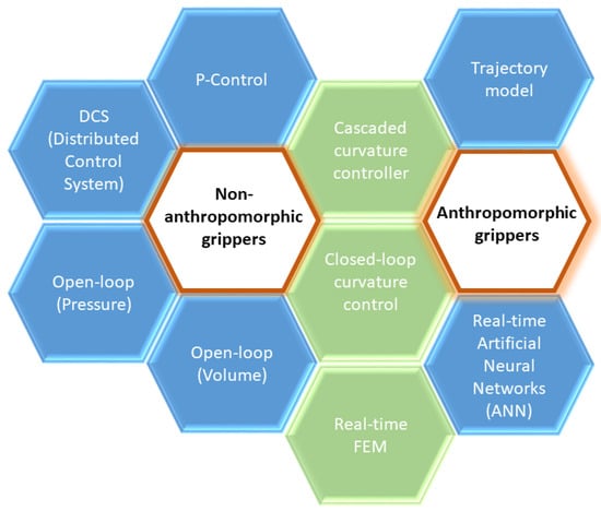 Several control philosophies proposed for FEA-type soft actuators. The control philosophies that have been proposed for a particular type of soft gripper (anthropomorphic or non-anthropomorphic) are presented in blue, while those proposed for both types are shown in green.