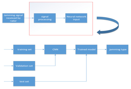 The jamming signal received by the radar was processed through a series of processing to obtain the input data of the neural network, and the data were divided into a training set, a verification set, and a test set. The training set was input into the training network with the CNN network as its core to obtain the network weights by iterative training. The verification set was used to verify the correct rate of network recognition and find the optimal network weight with the highest test accuracy. In the recognition process, the test set was input into the network model loaded with the optimal network weights for recognition.