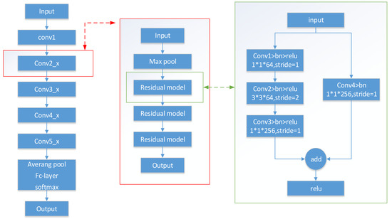 In order to achieve higher recognition accuracy, this paper uses the ResNet50 [21] network in the deep residual network (ResNet) of the CNN as the core of the recognition model. ResNet was proposed by Microsoft Labs in 2015. With the help of the residual module in the network, it achieved an ultra-deep network structure (more than 1000 layers), and used Batch normalization to accelerate the training. ResNet won first place in the classification task and first place in target detection in the ImageNet competition that year. It also won first place in target detection and image segmentation in the COCO (Microsoft Common Objects in Context) dataset. COCO is a large and rich object detection, segmentation, and subtitle data set. It originated from the Microsoft COCO data set, which was founded by Microsoft in 2014. Like the ImageNet competition, it is regarded as one of the most significant competitions in the field of computer vision.