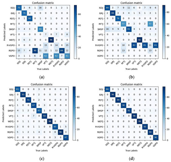 Confusion matrix of the four methods. (a) Only jamming signal. (b) Jamming plus echo. (c) Multi-pulse jamming plus echo fusion. (d) Multi-pulse jamming plus original signal fusion.