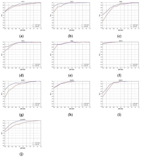 Comparison of recognition accuracy of 10 kinds of jamming between jamming plus echo and jamming plus original signal. (a) RFTJ. (b) VFTJ. (c) ISDJ. (d) PDTJ. (e) ISRJ. (f) WDTJ. (g) SMSP. (h) RGPO. (i) VGPO. (j) R-VGPO.