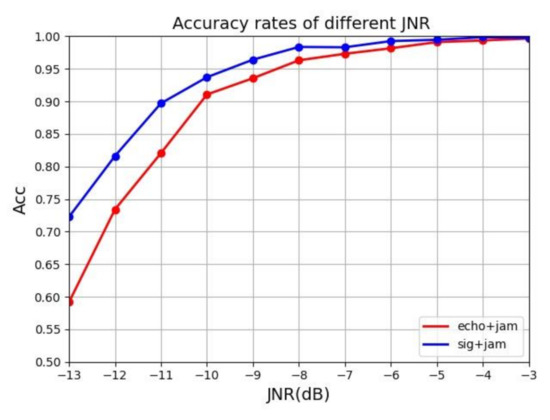 It can be seen from Figure 10 that in the case of high JNR, two methods had higher accuracy rates of jamming recognition. When the JNR decreased, different jamming types interfered, and the accuracy rate of the jamming recognition was reduced. In the case of low JNR, the recognition accuracy of the original signal plus jamming was higher than the recognition accuracy of the echo signal plus jamming.