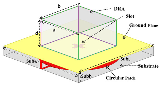 A ceramic ECCOS-TOCK Hik material type Dielectric Resonator antenna is used with permittivity εr = 10 and loss tangent 0.002 over a substrate of Roger RT/Duroid 5880 with permittivity 2.2 and loss tangent 0.009. The ground plane is above the substrate and a micro strip patch is used as feed and is placed below the substrate. The slot is created via the ground plane over which the DRA is placed. The slot dimensions are calculated with respect to the resonating wavelength 11.52 mm and are further optimized to match with required input impedance of 50 Ohm. The calculated dimensions of the DRA are a = 2.9 mm, b = 2.6 mm and d = 1.4 mm which is shown in Figure 1. The calculated dimensions of the substrate are SubL = 5.76 mm, SubW = 5.76 mm, Subh = 0.254 mm. The feed line dimensions calculated are L1 = 0.63 mm, L1W = 0.15 mm. The position of the DRA can be moved either along x or y direction to achieve an efficient coupling. Here a high-quality factor (Q) vale of 14 has been achieved theoretically considering the permittivity of DRA as 10. The resonant frequency of the DRA is proportional to єr−0.5, so for a wide range of permittivity values can be used to resonate the antenna at required frequency bands. Figure 1 represents the DRA design method. The theoretical calculations for resonating frequency of a rectangular dielectric resonator antenna are shown in Equations (1) and (2).