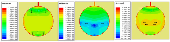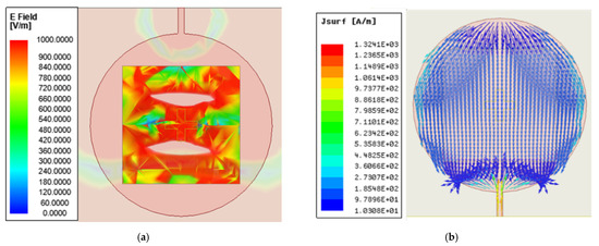 The gain enhancement occurs by changing the rectangular slot to a cross slot, where a cross slot fed DRA acts as a magnetic dipole. There a slight improvement in the gain values has been achieved from rectangular to cross slot over the ground plane. The cross slot excites the DRA with higher electrical energy coupling resulting in enhancing the gain of the DRA. The impedance variation occurs when a rectangular slot is replaced with a cross slot over the ground plane. The slot dimensions are responsible for the coupling between the DRA and the circular microstrip patch. The gain improvement of 0.35 dB has been recorded here. The cross slot enhances gain with minimum cross polarization. The rectangular slot is placed at the upper edge of the DRA, but the cross slot is placed at the center of the DRA. These slot positions are optimized locations and are studied and fixed to resonate at the desired resonating frequency of the antenna. The study of mode excitation and fields is shown in Figure 5 and Figure 6.