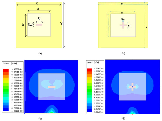 Evolution of the antenna design: (a) Micro strip line fed with rectangular slot DRA; (b) Circular patch fed cross slot DRA (c) Surface current density over a rectangular slot (d) Surface Current density over a cross slot.