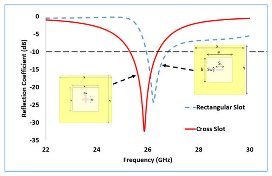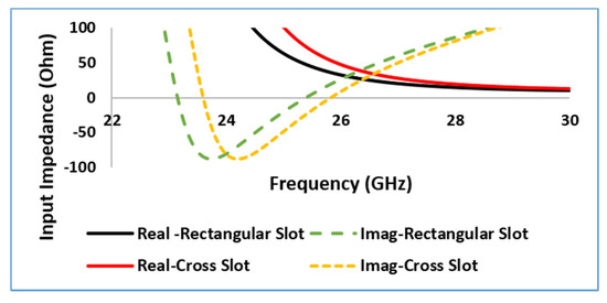 In millimeter waves the dimensions of substrate and ground plane are calculated in terms of wavelength of desired resonating frequency and controlled to uniform the field distribution and fringing fields over the DRA and the ground plane. The Electric fields over the metallic patch are radiating outwards and is maximum at the feed point as a conventional radiator. The DRA works like a magnetic dipole under is characteristics mode of excitation as shown in Figure 7c,d. The characteristics of both the rectangular and cross slot are studied and its performance analysis is recorded in Table 4. The cross slot has achieved high gain and wide bandwidth and high isolation as compared to the rectangular slot on the ground plane. Figure 9 shows the reflection coefficient of both the rectangular and cross slot and Figure 10 shows the corresponding input impedances at the resonating frequencies. The dimensions of the slot apertures for both rectangular and cross slot are remained uniform. The center of the cross slot and rectangular slot are coincided with the DRA and the coordinate axes. The co and cross pol radiation pattern for both the rectangular and cross slot are shown in Figure 11 and Figure 12.