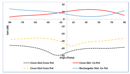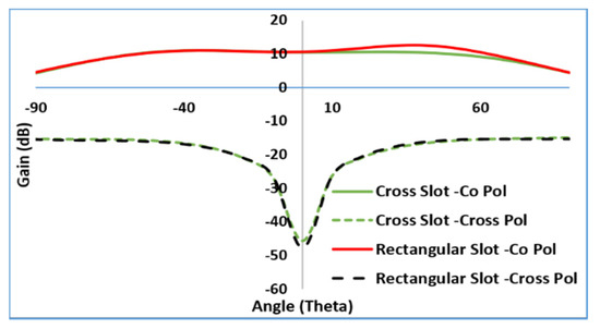 The simulated gain values for both rectangular and cross slot in both co and cross polarization is shown in Figure 11 and Figure 12 in both YZ plane and XZ plane, respectively. There is non-uniform radiation pattern with low cross pol power in both the planes. The maximum radiation is along the broadside direction of the antenna. The simulation study has been carried including all the antenna parameters as reflection coefficient, gain, and radiation pattern for both the rectangular and cross slot on the ground plane.