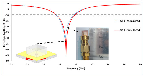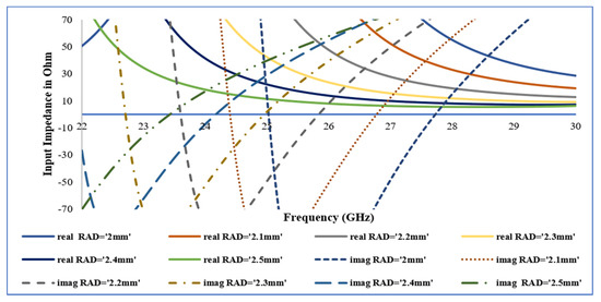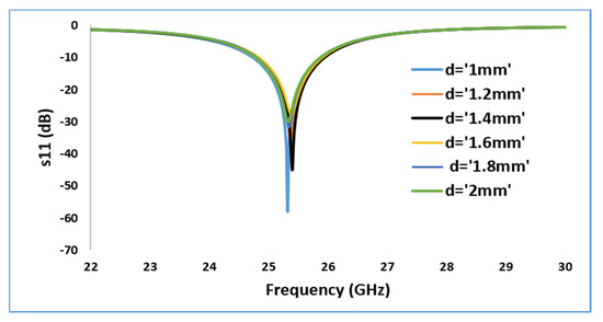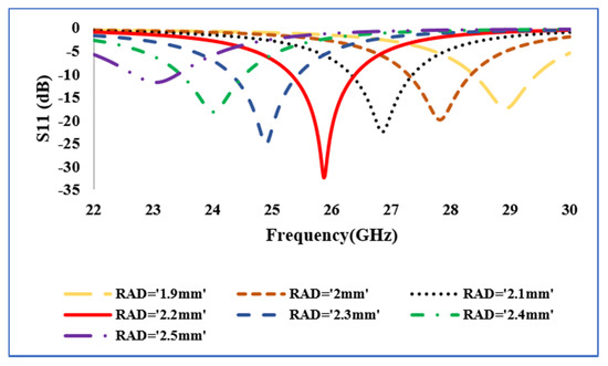 The patch radius is varied with different radius to achieve the desired impedance bandwidth. The simulation study of the patch radius is also carried out and its reflection coefficient is shown in Figure 15. At patch radius 2.2 mm it has achieved maximum isolation of −32.4 dB and other values isolation data is shown in Table 4 at different patch radius. The input impedance at 26 GHz with patch radius 2.2 mm is 49 Ohm which matches with the characteristic’s impedance of the antenna. The simulated and measured reflection coefficient isolation is −44.82 dB and −29.23 dB, respectively. The DRA dimensions are calculated and are optimized in terms of the aspect ratio with respect to the Q factor. A bandwidth of 1.12 GHz is suitable to use this antenna for indoor 5G small cells. Here the DRA is excited under the characteristic’s mode TE 1Y1. The aspect can be optimized by changing the height of the DRA. Figure 16 shows the reflection coefficient of DRA at different DRA heights.