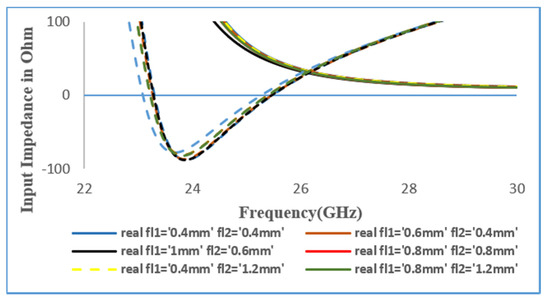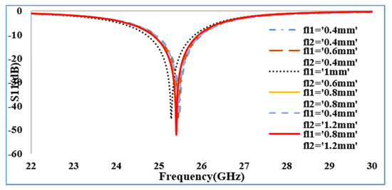 Reflection coefficient (dB) vs. Frequency (GHz) at different feed length (fl).