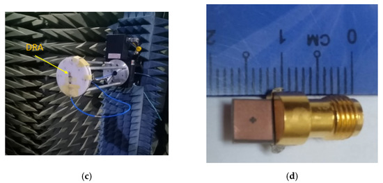 Fabricated Rectangular DRA at resonating frequency 26 GHz (a) Rectangular DRA Top View; (b) side view (c) Measurement in anechoic chamber (d) Cross slot aperture.