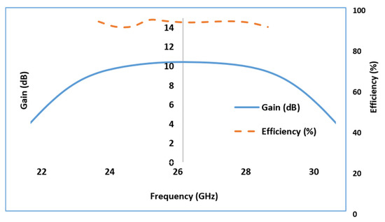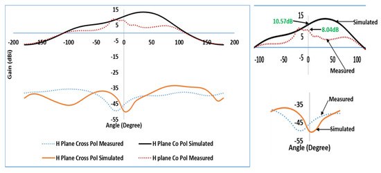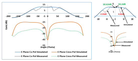 Figure 20 represents the gain and efficiency measured at the desired resonating frequency. The DRA exhibits a higher efficiency of 96 percentage and gain improvement to 10 dB. Figure 21 and Figure 22 represents the gain of DRA both in E plane and H plane. The simulated isolation in cross pol power in E plane is −45.62 dB and in H plane is −49.73 dB. The measured values of isolation in cross pol −43.64 dB in E plane and −49.12 dB in H plane. The simulated and measured gain of the DRA is 10.57 dB and 8.04 dB, respectively. The cross slot in the ground plane has reduced the cross-pol power and has enhanced the gain of the DRA. The cross pol reduces the back-lobe radiation of the antenna. There is slight shift in the cross-pol minima by 10 degree in the measured results. Similarly, the co pol and cross pol power in H plane is shifted by 10 degree. The recorded efficiency of the DRA is 96 percent, as the slot impedance is 49 ohm which is very close to the characteristic’s impedance of 50 ohm. So maximum power has been delivered to the antenna enhancing its gain and efficiency. In Table 7, the previous work on DRA has been recorded and compared with this work at millimeter wave frequency bands. This singly fed DRA design has more advantages compared to the previous work in terms and gain and efficiency. The DRA designed here can be used as an efficient radiator for 5G indoor small cells. The antenna is linearly polarized and has maximum radiation along the broadside direction which can help in minimizing the path loss component of the propagation. The performance parameters as bandwidth, gain, efficiency, and radiation pattern are shown here.