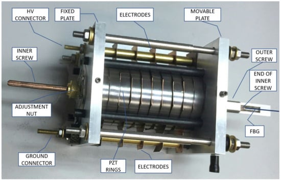 A drawing of the mechanical structure of the Optical Voltage Transformer is shown schematically in Figure 1. The assembly includes a stack of 10 PZT rings fixed between two aluminum sustention plates (one is fixed, while the other is movable); two coaxial screws, each one fixed to one sustention plate; 11 copper electrodes inserted between the PZT rings; and an FBG bonded between the screw extremities. The screws are coaxially arranged to allow one sliding inside the other, and each one fixed to one sustention plate. Therefore, any elongation or shrinking of the PZT stack will be transmitted through the screws to the FBG.